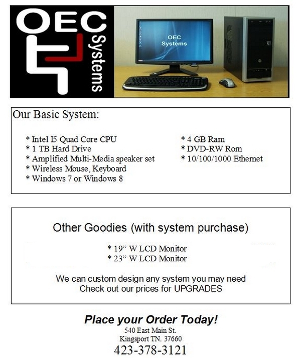 OEC builds each system to meet the demanding needs of our customers. Home systems with Internet capability, office workstations, network servers and Internet servers are all configured to the specifications of each client. Our computers are also designed to allow for expansion in the future. And if you are constantly on-the-go, we offer a full line of notebooks as well.